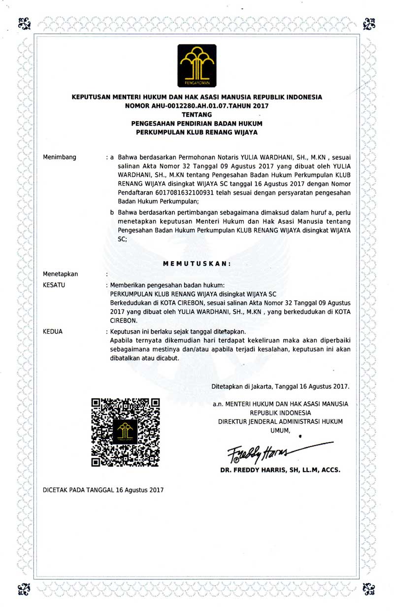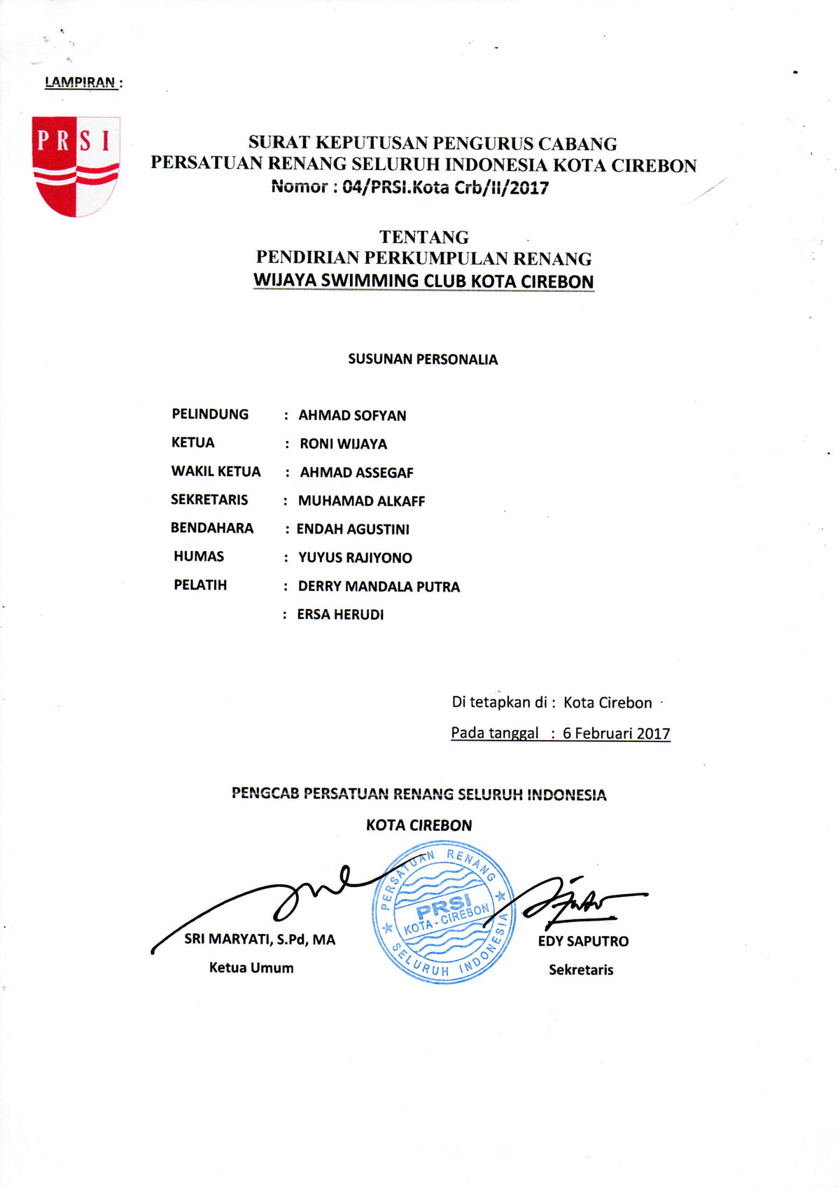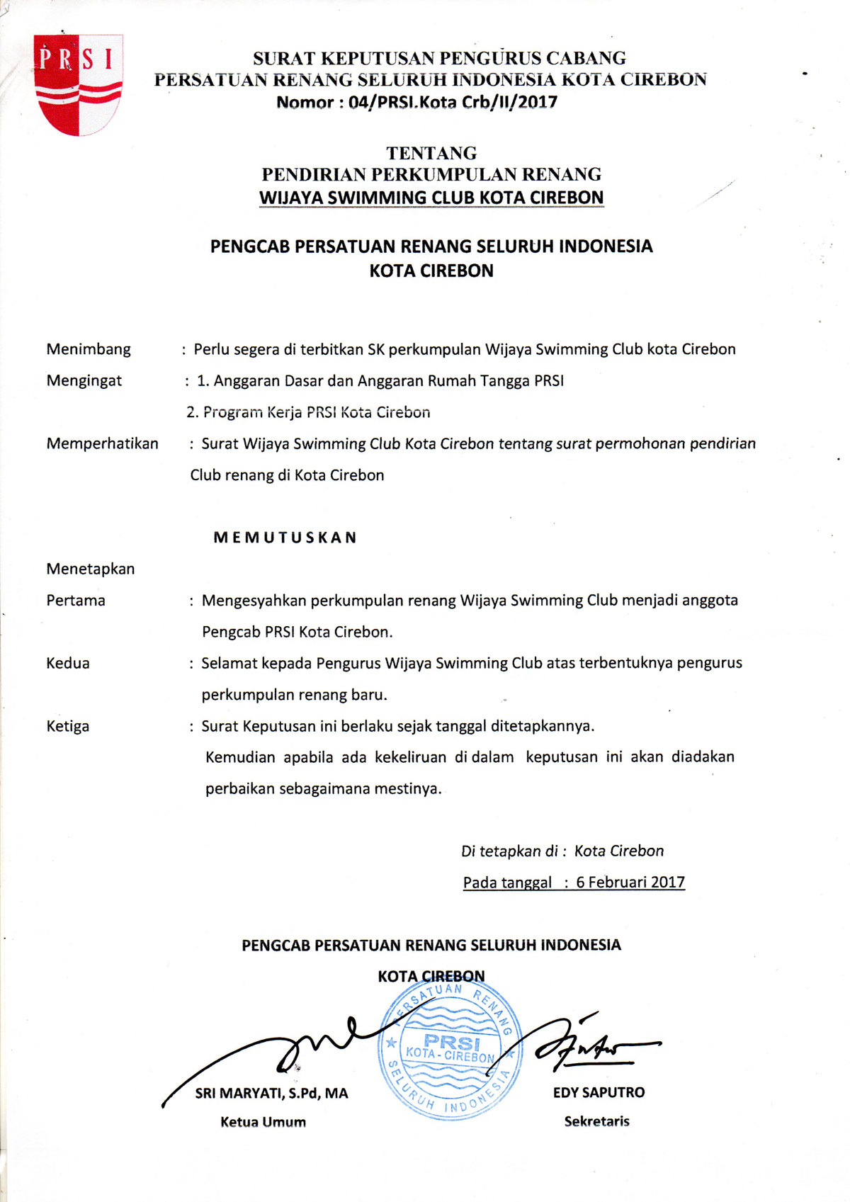Dokumen akta pendirian resmi Wijaya Swimming Club