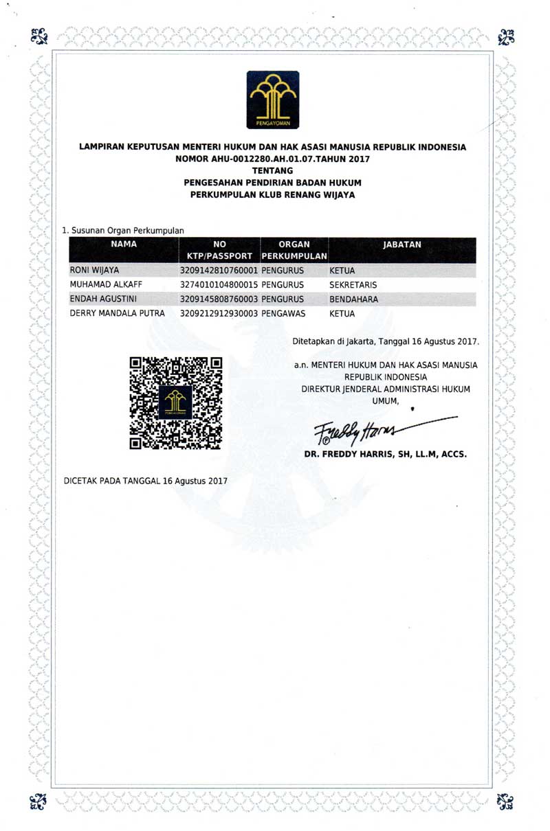 Wijaya Swimming Club adalah organisasi resmi yang terdaftar secara hukum. Berikut adalah dokumen-dokumen legalitas kami.